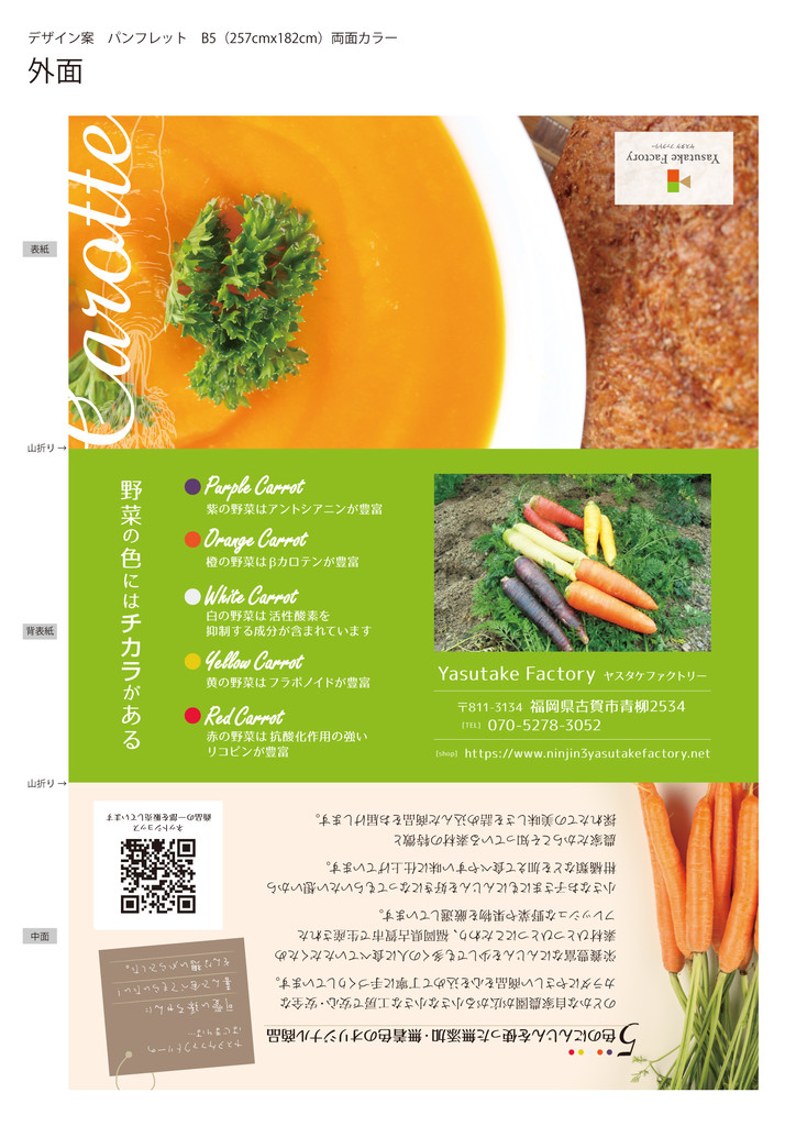 食品パンフレット 2021年4月11日 morei 農家さんがジュースやジャムをオリジナルで製造しています。栄養豊富な人参の特長と自家製商品への想いをたくさん届けられるよう構成しました。また、商品単価にあわせ、高級感の感じられる繊細な雰囲気にデザインいたしました。 仕様 B5 両面カラー/Z折・3つ折 制作内容 ディレクションデザイン商品写真撮影印刷入稿 制作期間 2週間程度/2019年 備考 ネットショップ Yasutake Factory